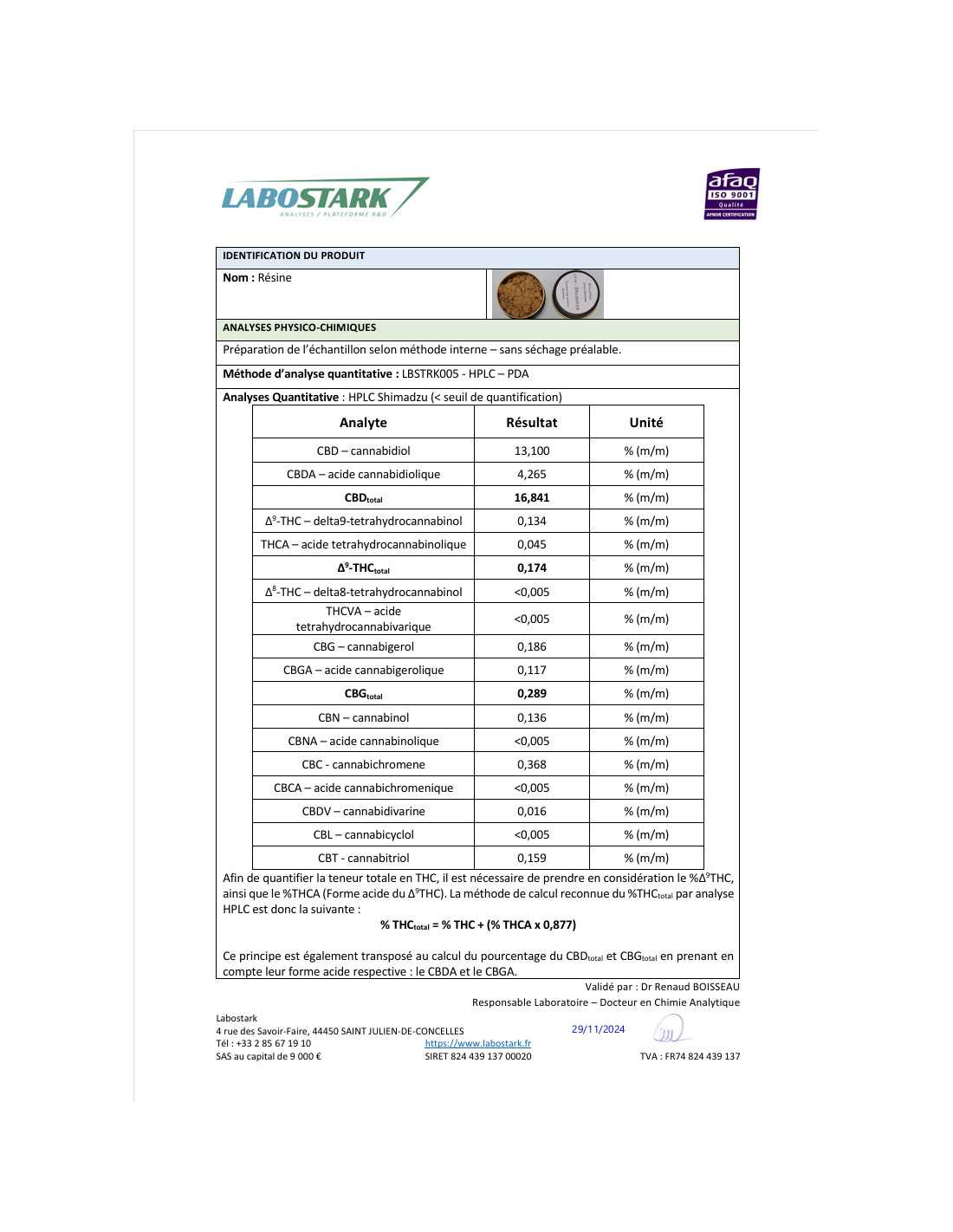 Ja, denna hasch är 100% laglig eftersom den har en THC-halt under gränsvärdet 0,2%. Detta framgår också av analysen på bilden.